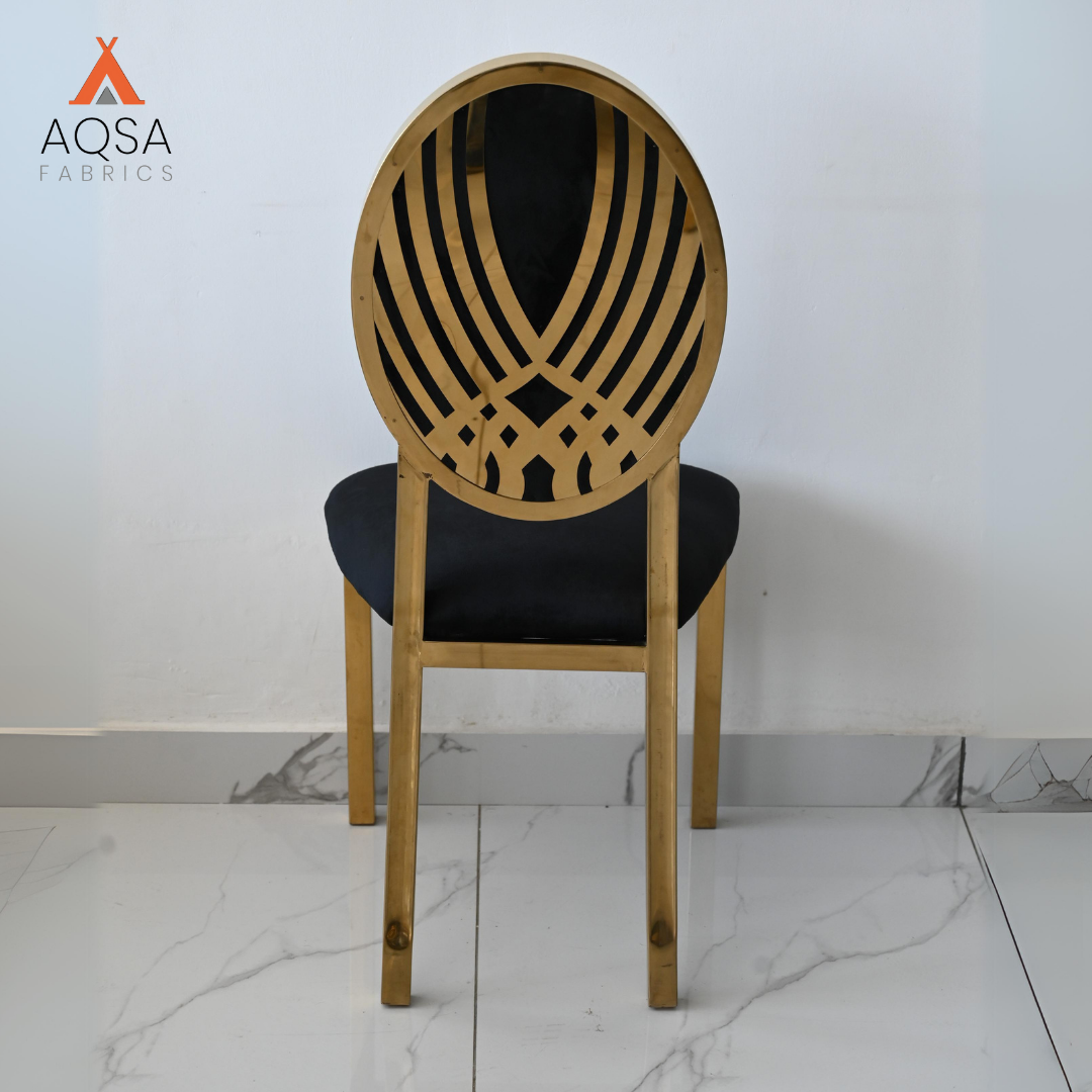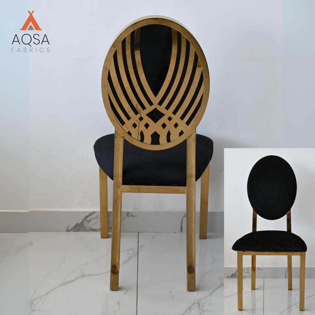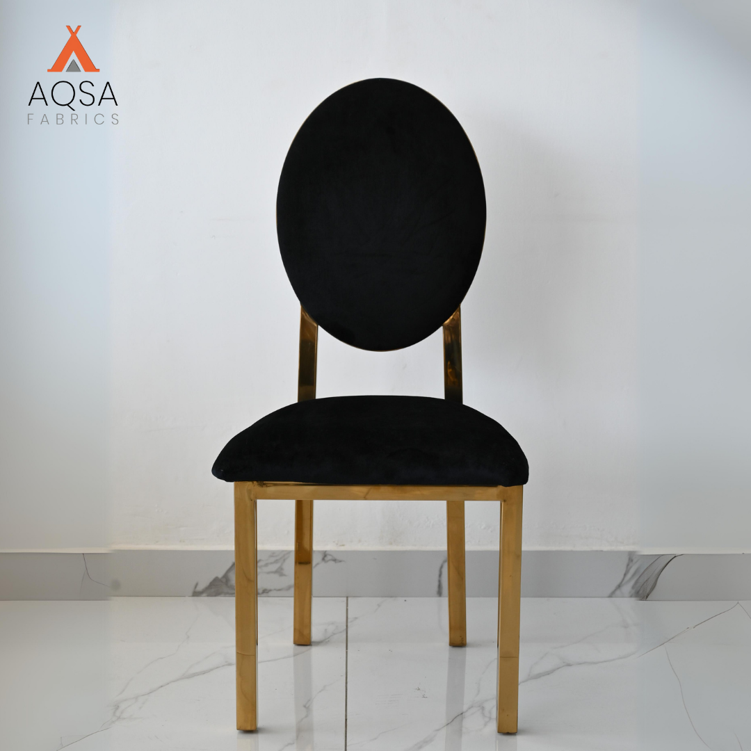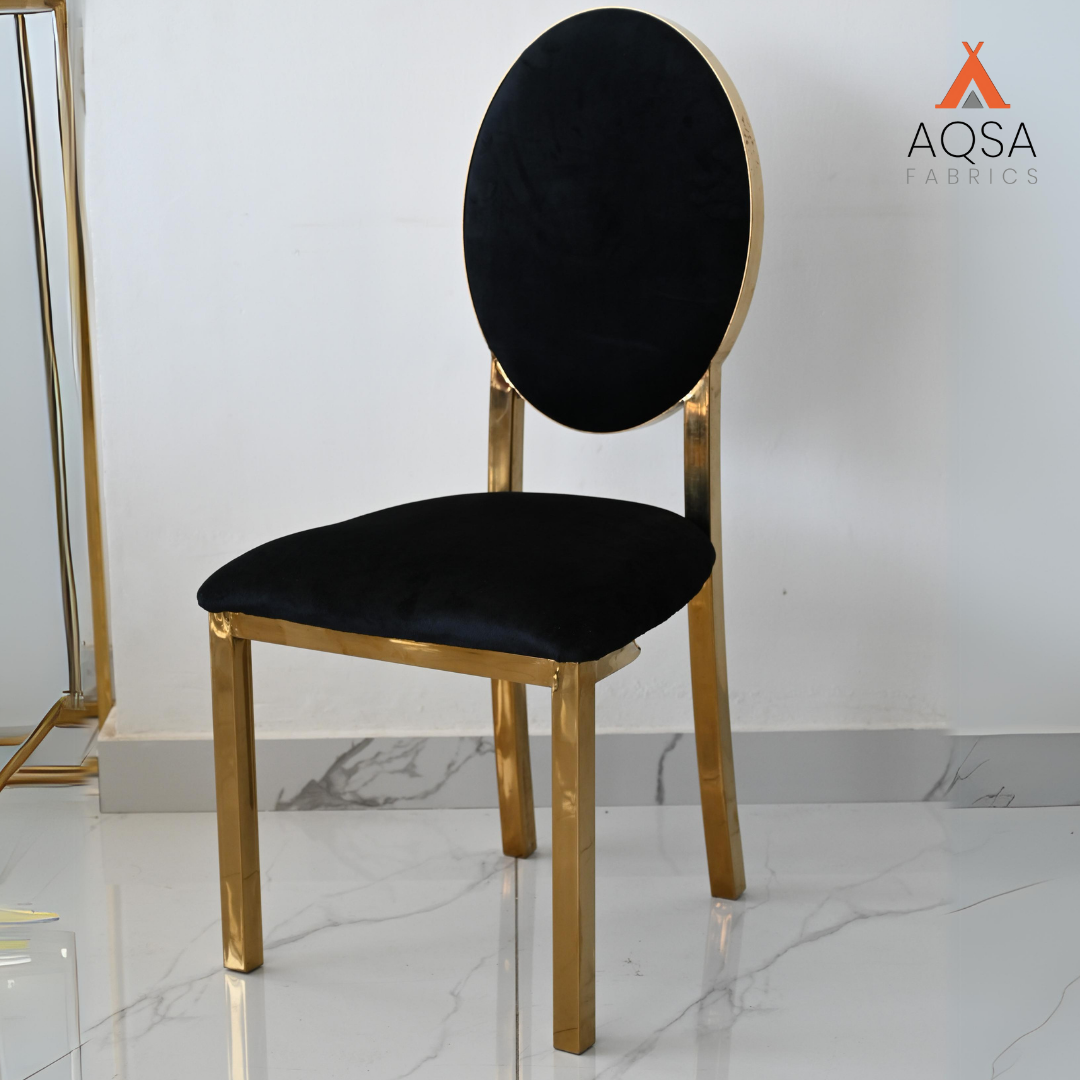 This High Quality Velvet Home Dining Chair is made with gold metal and stainless steel, with straight chair legs, making it a stylish and durable option for any dining setting. Unique golden metal backside design. Its luxurious velvet material provides a comfortable seating experience, perfect for weddings, events, and fine dining restaurants. Available in an elegant black color.