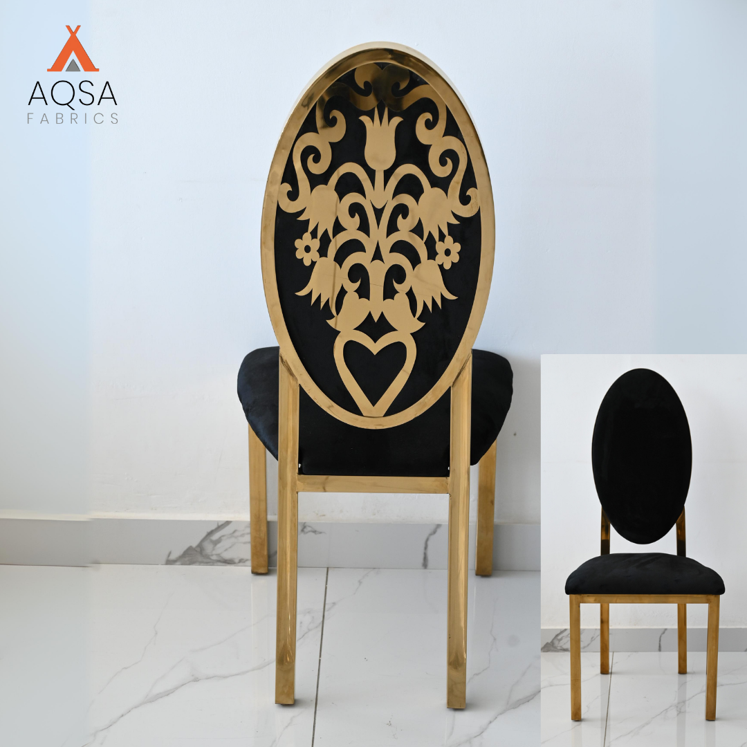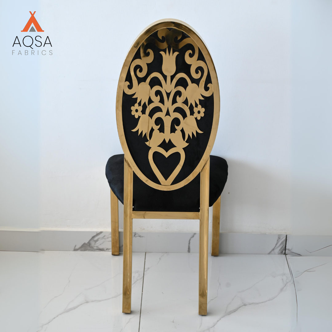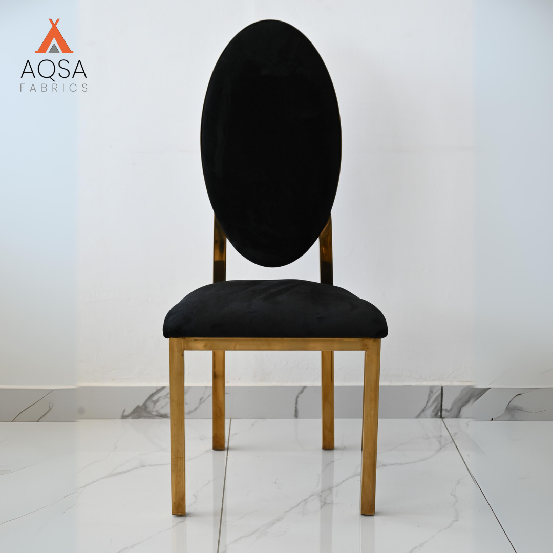 This High Quality Velvet Home Dining Chair is made with gold metal and stainless steel, with straight chair legs, making it a stylish and durable option for any dining setting. Unique golden metal backside design. Its luxurious velvet material provides a comfortable seating experience, perfect for weddings, events, and fine dining restaurants. Available in an elegant black color.