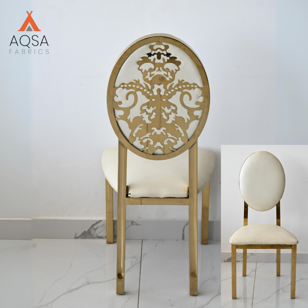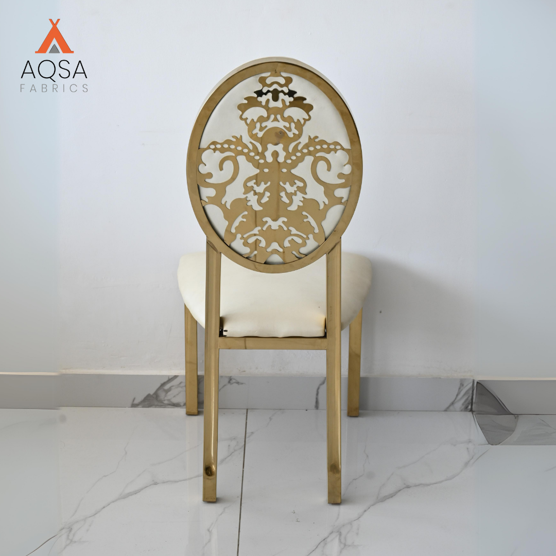 This High Quality Velvet Home Dining Chair is made with gold metal and stainless steel, with straight chair legs, making it a stylish and durable option for any dining setting. Unique golden metal backside design. Its luxurious velvet material provides a comfortable seating experience, perfect for weddings, events, and fine dining restaurants. Available in an elegant off white color.